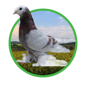 Kräftige Taube mit breiter Brust und nahezu waagerechter Haltung. Typisch sind der weiße Kopf mit klarer Abgrenzung unter dem Auge, üppige Latschen mit Geierfedern sowie eine federreiche Schnabelnelke. Es sind 13 Farbenschläge anerkannt, bei denen nur Kopf, Latschen und Teile der Schwingen weiß sind.